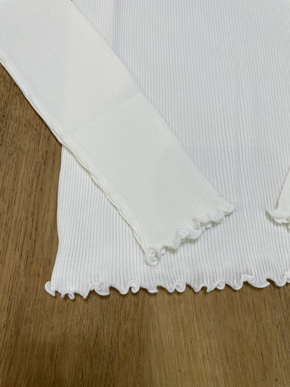 端がひらひらとなり華奢に見えるように細くロックミシンをかける仕様です。