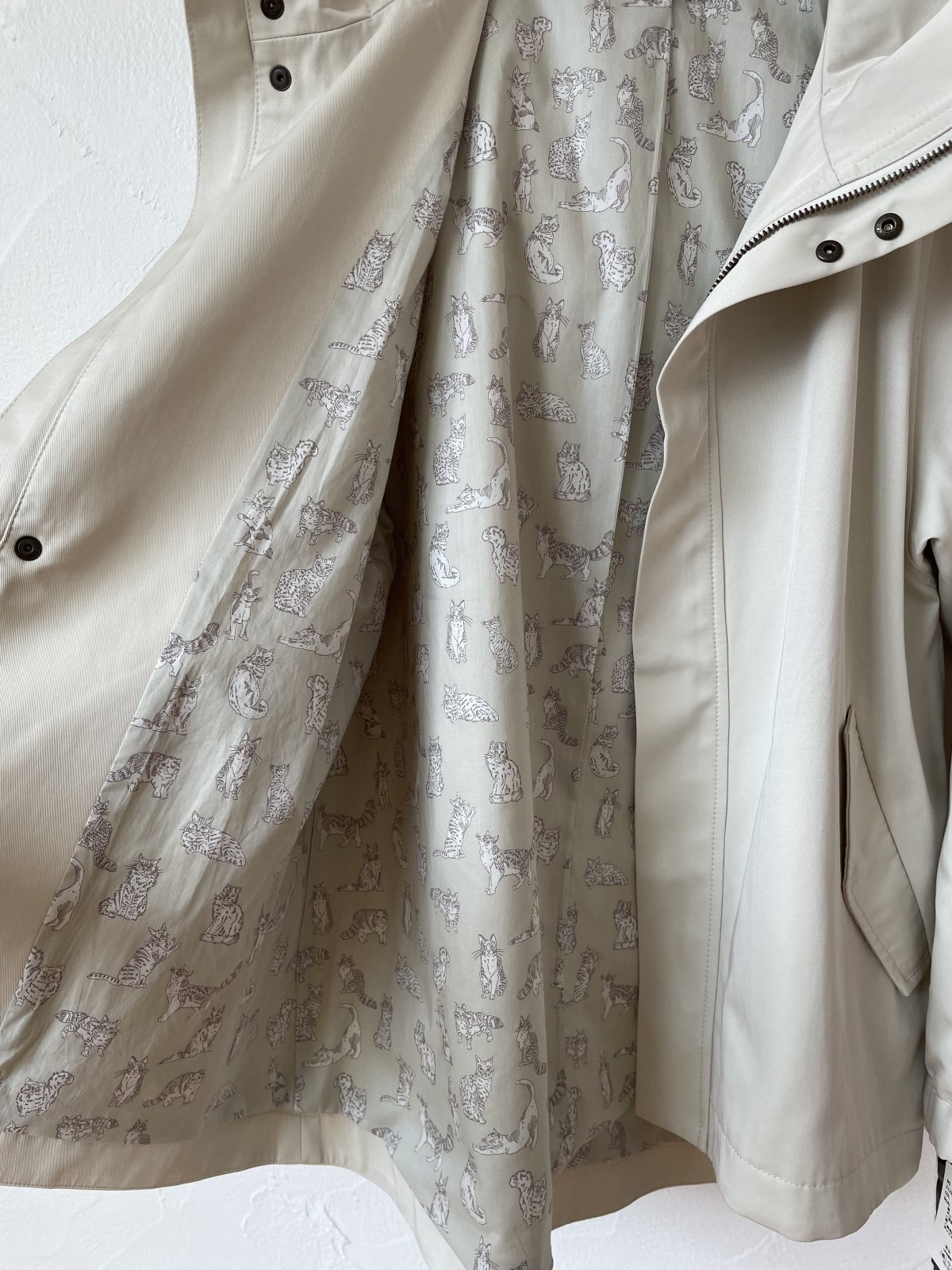 裏地にリバティプリントMeowを使用したフード付きジャケットです。