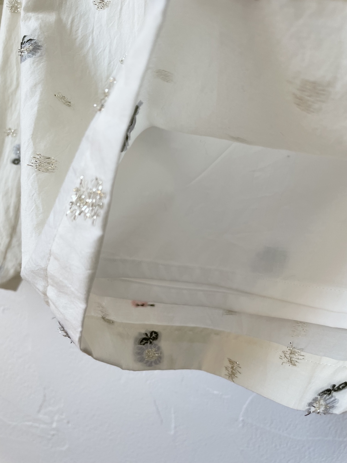 少し白んだ空気の中に花や緑、光が舞っているような生地です。